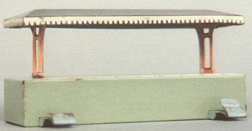 Oben: Der kleine Bahnsteig mit Dach. Heute bezeichnet man so etwas als einen Haltepunkt. Die Länge beträgt nur 11 cm. In den größeren Sets waren immer ein Bahnhof und ein Bahnsteig enthalten, so daß man die Passagiere an verschiedenen Orten ein- und aussteigen lassen konnte.