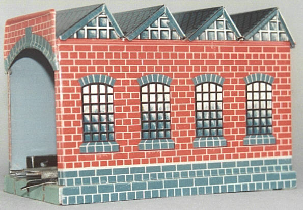 oben: Den Lokschuppen gab es in einer Uhrwerk-Ausführung und (wie hier gezeigt) in der elektrischen Variante mit Mittelleiter. Die letztere Variante ist selten, da mehr Uhrwerk-Sets verkauft wurden, als elektrische Startpackungen. Der kleine schwarze Kasten am Eingang bewirkt die Umschaltung der Fahrtrichtung bei elektrischen Loks, sobald sie in den Schuppen einfahren. Es sieht lustig aus, wenn die kleine Tenderlok in den Schuppen saust und gleich wieder herausfährt. Bei angehängten Wagen kommt es dann oft zu Entgleisungen, da diese je nur etwa 20 Gramm schwer sind und im Schiebebetrieb leicht aus den Gleisen springen.
