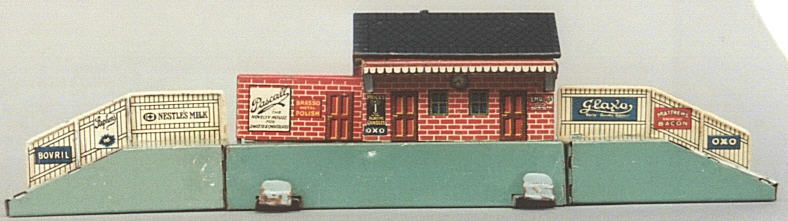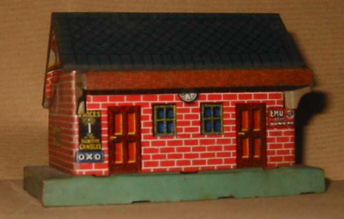 oben: Der kleine Bahnhof von Bing Tischbahn ist selten zu finden. Er wurde nur mit einer bestimmten Zugpackung ausgeliefert (No 3 set, 1925-27). Als Grundplatte diente aus Gründen der Rationalisierung die der Signal Box. Der ähnliche Bahnhof von Karl Bub ist interessanterweise nicht identisch, wo doch eigentlich die Vermutung nahe liegt, dass hier Bing Werkzeuge verfügbar gewesen sein könnten. Er hat andere Maße.