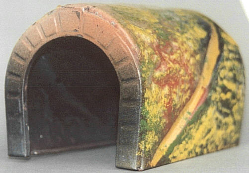 oben: Der Tunnel ist etwa 10 cm hoch und knapp 13 cm lang. Die zierlichen Bing-Loks passen gerade mal so hindurch. Eine Märklin-Maschine mit Stromabnehmer wäre schon zu groß.