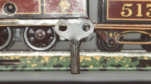 Ohne den Schlüssel geht es nicht. 6-9 mal darf man ihn drehen. Dann ist das Uhrwerk voll gespannt. Die Lok läuft damit 2 Runden in einem mittleren Oval. Es gab später auch ein größeres Uhrwerk mit höherer Leistung. Einen Rückwärtsgang gibt es nicht. Über dem Führerstand ragt der Start/Stop-Knopf aus dem Dach.