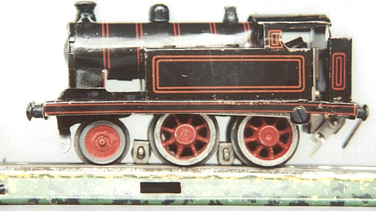 unten: Unter dem Heck der Tenderlok ist die Trommel für die Fahrtrichtungs-Umschaltung. Sie wird von Hand bedient oder von den Schaltkästen der Lokschuppen oder den extra angebrachten Umschaltblechen am Gleis. Eine aufgeklebte Streicholzschachtel tut es auch. Es geht vorwärts und rückwärts. Die Lok fährt mit 6 bis 8 Volt Wechselstrom. Man kann bequem mit einem modernen Märklin Trafo fahren, muß dabei aber etwas auf die Höchstspannung achten. Der Antrieb wirkt nur auf die hintere Treibachse und ist sehr einfach gehalten. Wegen der leichten Wagen reicht die Kraft der Lok aber für einen kleinen 3-Wagen-Zug aus. Der Rollenschleifer ist gut zu erkennen.