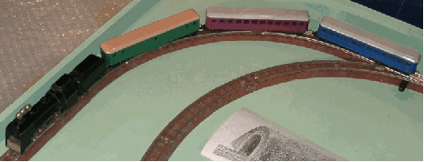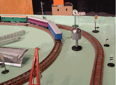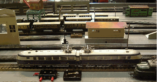 Links eine Detailaufnahme der bekannten Trix / Märklin Anlage mit einem TW800. Dahinter Trix Vorkriegszüge.