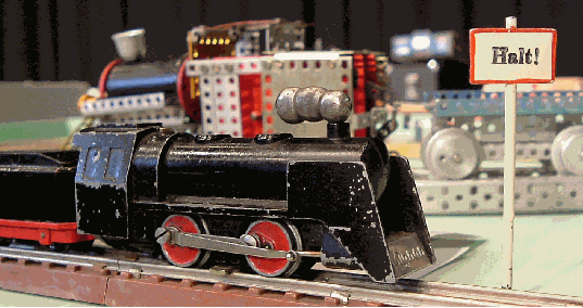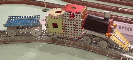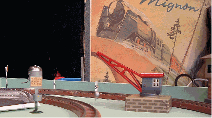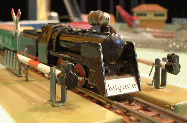 Neben der Bahn stellt Mignon auch einen Metallbaukasten her, der etwas an den Trix Kasten erinnert. Unten ein Konstruktionsbeispiel. Die großen Hersteller machten mit ihren Patentansprüchen Mignon das Leben schwer, so dass man die Produktion der Bahn schon nach nur 2 Jahren einstellte. Die Anlage ist nicht besonders groß, beeindruckt aber durch die schöne Form der Modelle und die liebevolle Ausstattung mit verschiedenem Zubehör. Der Bahnübergang ist ebenfalls von Kibri und trägt die geschwungene Aufschrift Mignon. Im Stellwerkhaus ist der Trafo untergebracht.