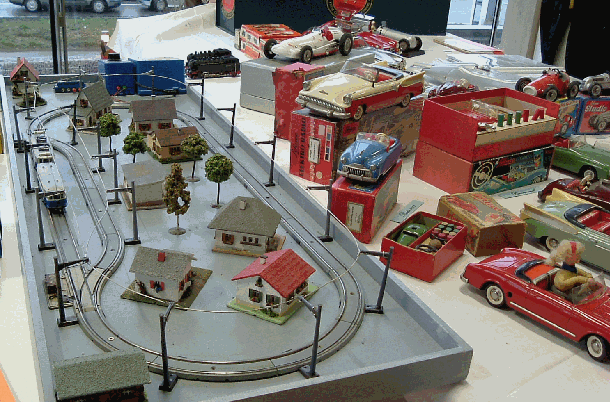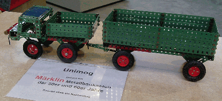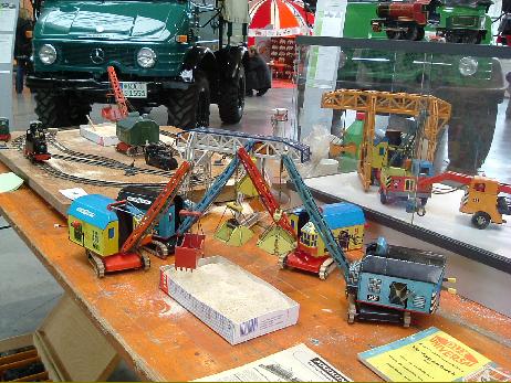 Links die Billerbagger und Biller Eigenbau-Echtdampflok, oben ein Unimog aus Metallbaukastenteilen von Märklin, unten eine weitere Billerbahn Anlage und die Unimogs hinter unserer 1960er Anlage.