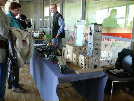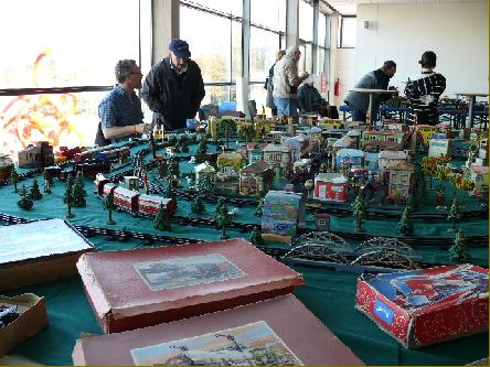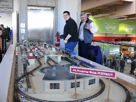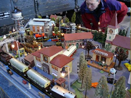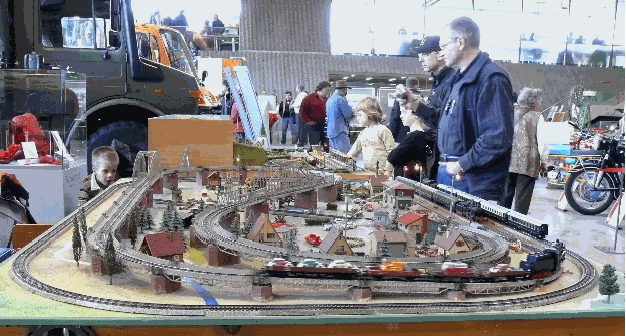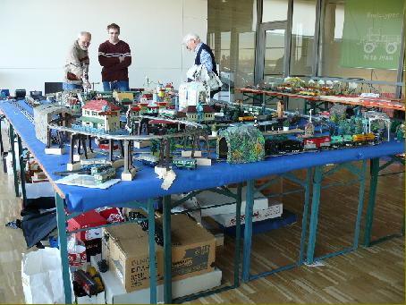 Rechts die gemischten Spur S und 0 Bahnen von Holger auf verschiedenen Ebenen. Er war schon 2007 dabei. Darunter ein neues Talent im Bau und Vorführung von 50er Jahre Märklin-Anlagen. Volker hat uns allen gezeigt, wie man schnell, sparsam und genial einfach eine leicht zu transportierende Anlage konzipiert. Wie man sieht hatte er und sein Vater viel Spaß dabei. Ruckzuck war das ganz schnell im Wohnmobil verstaut. Wir haben somit guten Grund zur Hoffnung, dass jüngere Hobbykollegen nachkommen.