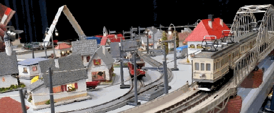Links die HAMO Anlage mit den seltenen Kurbeln. Damit wird die Geschwindigkeit der Bahn geregelt. Schöne alte Holzhäuser sind ebenfalls sehr selten und werden bei uns häufiger zu sehen sein. Man beachte die Schule vor der großen Blechbrücke.