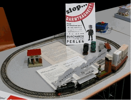 Wer auf Reisen Beschwerden bekommt, kann sich mit Burchards Pillen kurieren. Diese kuriose Bahnpackung von Märklin war als Werbehilfe für Apotheken in der 60er Jahren gedacht. Das stille Örtchen ist von Kibri und hilft aus, wenn das Häuschen auf dem Flachwagen nicht mehr ausreicht und der Andrang dank der Pillen steigt.