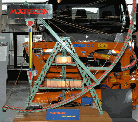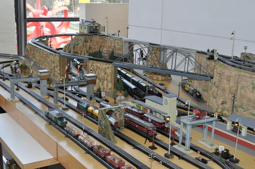 Ganz unten links die Märklin Sonnenuhr, ein Schaufenstermagnet aus Märklin Metallbaukasten und rechts daneben eine ausgewachsene TTR Manyways Station komplett aus Guss und Blech und tonnenschwer.