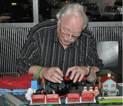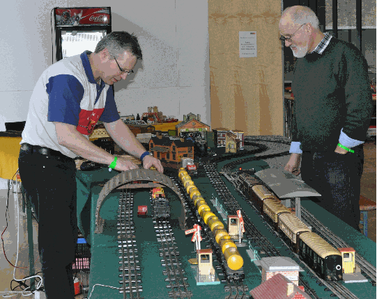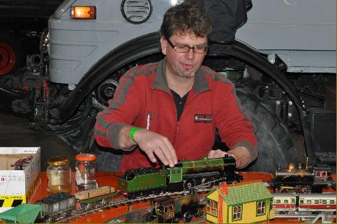 Unten die Herren im besten Alter beim Fahren der Echtdampfzüge und der Märklin Minex Bahn. Blech-Legende Botho Wagner ist mittlerweile auch fest im Team der Tischeisenbahner dabei und voll bei der Sache wie man sieht.
