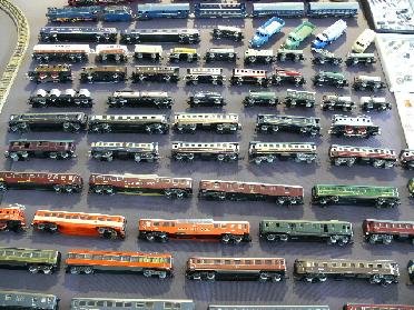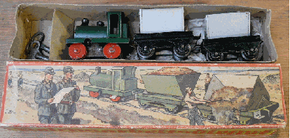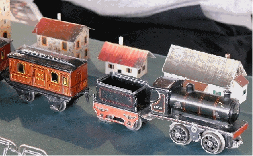 Oben Karl Bub Lorenzug, eine große Rarität. Rechts die Bing Tischbahn Spur 00 Anlage.