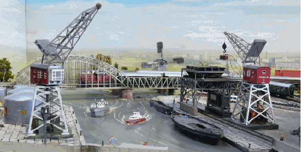 Die Hafenanlage aus Märklin Herstellung ist immer noch mein Favorit unter den originalen Schauanlagen aus Göppingen. Hier eine Szene mit Schiffsverkehr im Hafenbecken und zwei Anglern am Kai. Die Schiffe sind aus Pappe, die Brücken aus Blech, das Wasser ist als Ölgemälde dargestellt und die Kräne sind natürlich funktionsfähig. Der Hintergrund ist handgemalt. Solche Anlagen sind in Gestaltung und Ausstrahlung unerreicht!