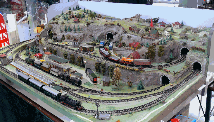 Rechts unsere neueste Märklin Schauanlage frisch restauriert. Es handelt sich um die vollautomatische Anlage 10 aus dem Märklin Gleisplanheft. Teile der Tunnelstrecken und die Rückwand wurden restauriert, die ganze Anlage gereinigt und teils neu verkabelt. Sie ist die bisher letzte Märklin Werksanlage unserer Sammlung und wurde um 1960 bei Märklin als Werbeträger gebaut.