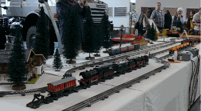 Unten die Märklin Liliput Bahn, eine Spur kleiner als null und etwas größer als 00. Die hier gezeigte Anlage ist extrem selten und nie in der Öffentlichkeit zu sehen, außer bei uns! Skeptische Blicke von rechts, ob das wirklich so klappt? Na, die Bahn ist doch noch gefahren und es gab auch die Güterwagen zu bestaunen, deren Existenz oft angezweifelt wird.