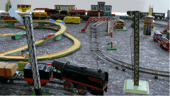 Beckh Spur 0 Uhrwerk-Eisenbahn und Tipp & Co Uhrwerk-Reichsautobahn demonstrieren den Einklang zwischen Bahn und Auto. Dazwischen noch weitere Stücke anderer Hersteller, so schön kann einfache Spieleisenbahn sein!