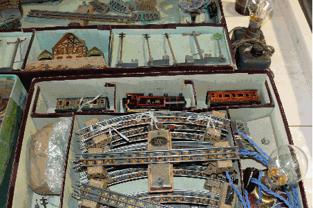 Links die Distler Drehstrombahn in Spur 0 zum ersten Mal bei uns und sonst fast nie zu sehen. Wie Zeuke und Buco Spur 0, so hat Distler hier ein Dreileitersystem mit 3 unabhängigen Stromschienen konstruiert. Ein sehr universelles Gleis, auf dem fast alles fahren kann. Es hab nur wenige Modelle zu dieser bahn und hier ist fast das gesamte Programm zu sehen.