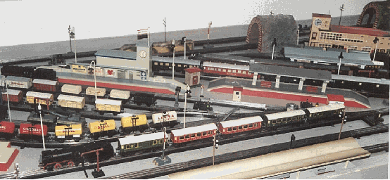 Gaggenau 2002 war so etwas wie eine Superschau. Diese 3 Bilder verdeutlichen den Quantensprung seit der letzten Vorführung nur ein halbes Jahr vorher. Bei Märklin haben wir jetzt fast alle Topmodelle auf der Anlage und bei Trix ist die Startserie von 1935 mit dabei. Es macht ganz einfach Spaß, zu sehen, was man als Gruppe auf die Beine stellen kann. Der Saal war an beiden Tagen proppenvoll und wir hatten viel Spaß am Hobby. Oben: Blauer ST800 aus den 50er Jahren, Pazifik HR800 vorkrieg und TWE700 in creme-rot. Rechts: blauer TW800 und R700 aus den 30er Jahren Unten: Trix-Teil mit Scheibenrad-Lok von 1935 und passenden Wagen, dahinter langer Tankwagenzug mit 20/68er Wagen und was man sonst noch an raren Güterwagen aus der Vorkriegszeit braucht. Die Holzgebäude sind die komplette Serie von 1935 im Bestzustand.