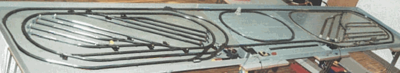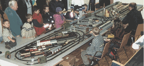 Zum ersten Mal in voller Größe wurde die auf 7 Meter erweiterte mobile Anlage zur Vorführung von Trix Express und Märklin dem Publikum gezeigt. Und zwar anlässlich der Modellbahnbörse am 24. und 25.11.2001 in Gaggenau (Jahnhalle). Der Einbau des Trix Förderbandes erfolgte noch rechtzeitig und einige befreundete Sammler haben mich beim Fahrbetrieb kräftig unterstützt.