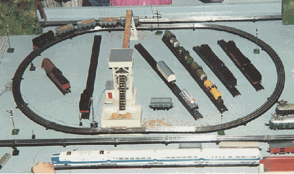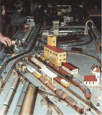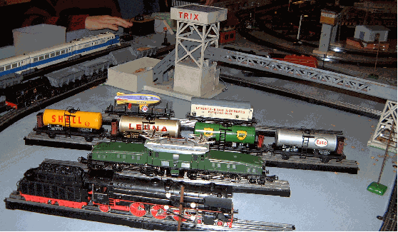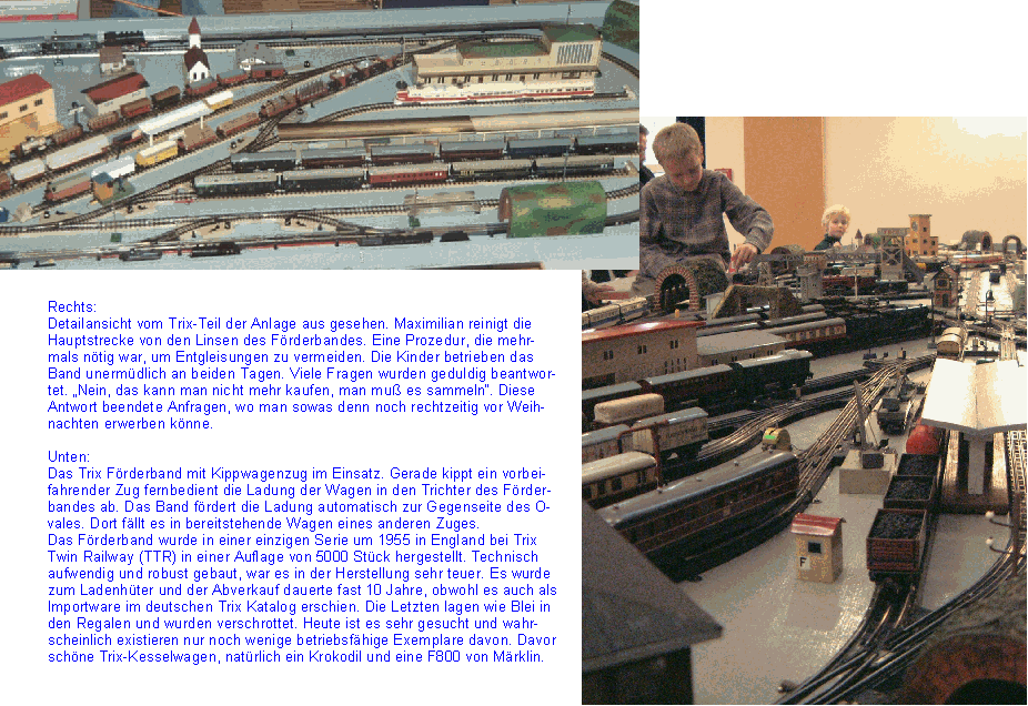 Rechts: Trix-Förderband in Aktion beim Beladen der Wagen. Im Vordergrund der blaue vierteilige und völlig originale ST800 von Märklin mit Mittelmotor und Kardanantrieb. Auch er mußte zeigen, was er kann. Der „Big Boy" befand sich gerade in seinem Kofferraum...