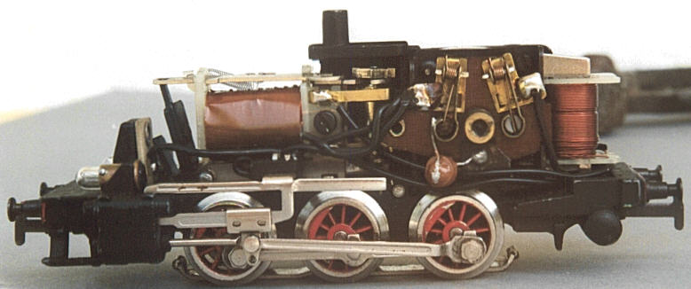 Ganz links die Lampen zur Beleuchtung, dann der Umschalter mit der kleinen Bakelitwalze. Das Motorschild aus Pertinax und in einfacher Ausführung ohne Öltaschen zur Ankerschmierung. Rechts davon die Stator-Wicklungen des Allstrommotors. Sie erzeugen das äußere Magnetfeld, in dem sich der Rotor (=Anker oder Kollektor) dreht. Einfache Kupplungshaken, einfache Steuerung (farblich richtig NICHT rot ausgelegt). Die Maschine ist im Originalzustand.