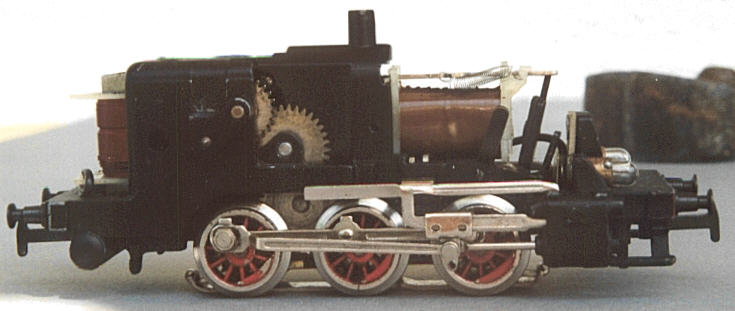 oben: Die Zahnradseite mit Handumschalterhebel vor dem Umschaltermagneten. Der Umschaltermagnet zieht die schwarze Klappe an und die Umschaltergabel bewegt den Stern der Umschalterwalze.