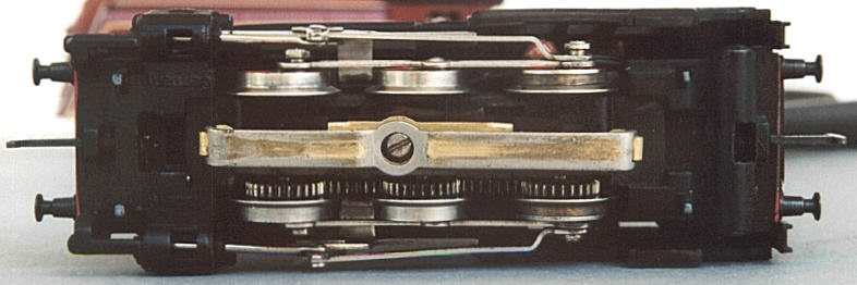 oben: Der originale Schleifer mit dem großen Loch in der Mitte. Der Schleifschuh kann bei Verschleiß ausgewechselt werden. Der hier hätte es mal dringend nötig. Transparente Haftreifen auf der letzten Achse.