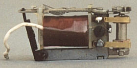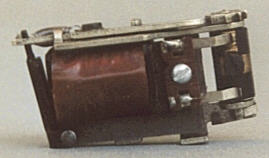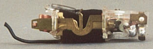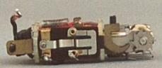 oben: Der erste Walzenumschalter mit großer Bakelitwalze. Zu finden in alten T800 oder SK800 und dergleichen. Durch Drehen des Hakens an der schwarzen Schlitzschraube in verschiedene Positionen kann der Umschalter justiert werden. Man kann die Feder mehr oder weniger vorspannen. Die Aluschraube mit Mutter gehört eigentlich nicht dazu und war eine Fotografierhilfe. Sie hält den Umschalter zusammen. An dieser Bohrung wird er im Lok-Gehäuse festgeschraubt. Deutlich erkennt man die beiden Kontaktlaschen an der Pertinaxplatte. Sie greifen die Spannung für die Motorwicklung der jeweiligen Fahrtrichtung an der Messingeinlage in der Umschalterwalze ab. Die Walze selbst ist ebenfalls auf der Walzenachse justierbar. Ein kleines technisches Meisterwerk!