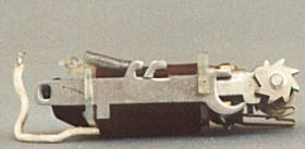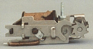 oben: Aus der Bakelitwalze wurde die Stahlwalze. Anstelle der teuren Messingleitbahn in der Walze gab es jetzt Pappscheibchen, welche die nach innen gebogenen Kontaktfahnen vom Metall der Walze abheben. Die Justierung der Walze entfiel. Die Vorspannung der Schaltfeder wurde jetzt durch Einhängen in 2 verschiedene Haken eingestellt. Der Stern an der Walze blieb und es wurde mehr Kunststoff am Spulenträger verarbeitet. Alles ein wenig billiger in der Herstellung. Dies ist der typische Umschalter der mittleren bis späten 50er Jahre. Die Schaltfolge blieb. Der Bocksprung auch.