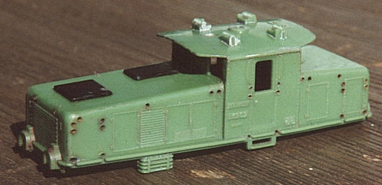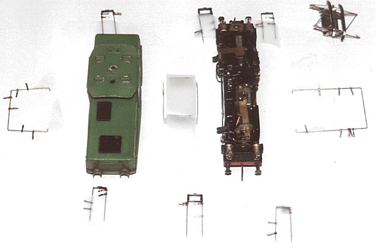 Zunächst wurden alle Anbauteile wie Griffstangen, Stromabnehmer, Cellonscheiben abgebaut. Nach kurzem (!) Bad des Gehäuses in Nitroverdünnung wurde der braune Altlack mit einem Pinsel entfernt. Zum Vorschein kam ein hellgrün durchgefärbtes Plastikgehäuse mit 2 Abdeckungen am Deck der Fahrzeugfront. Diese bestehen aus schwarz durchgefärbtem Plastik.