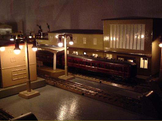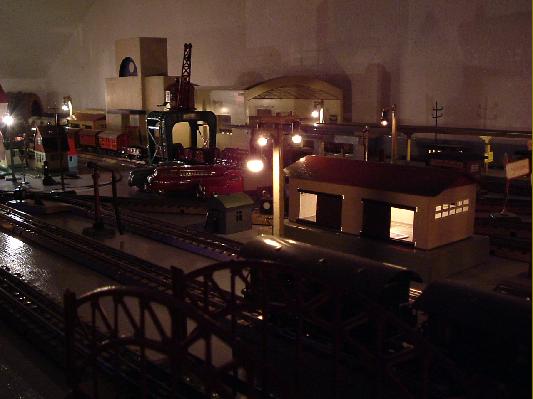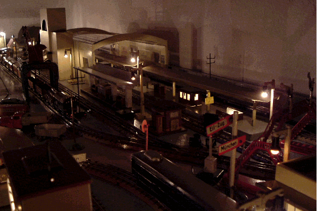 Märklinbereich mit langen Bahnsteigen aus Blech unter dem Trixburg. Passt eigentlich ganz gut zusammen.