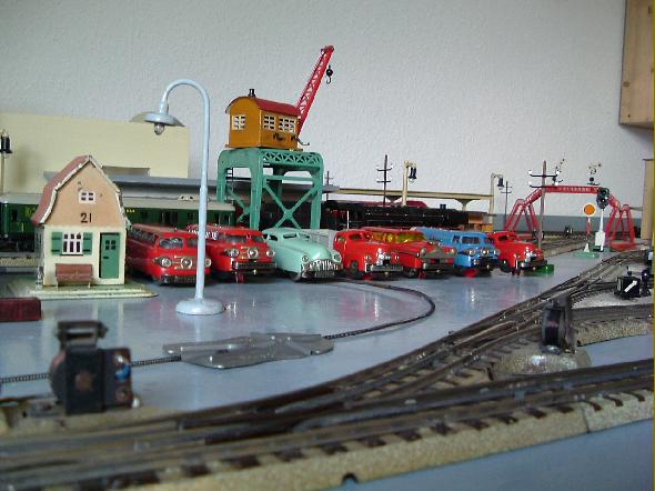 Tja, und links im Bild kann man erkennen, wie sowas endet. Meine Schuco Varianto Flotte auf der stationären Anlage inmitten der alten Züge und Gebäude. Von links nach rechts: Bus (cw), Feuerwehr (e), Limousine oder Limo genannt (cw), Lastwagen oder auch Lasto (e), Station Wagon (e), der besagte blaue Bus (e) und noch ein roter Lasto. (cw) = Uhrwerk (e) = Elektromotor 3 V, 2 Batterien AA